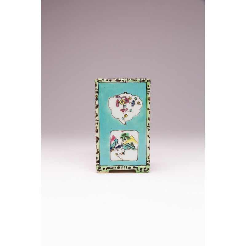 Each side decorated with various shaped cartouches, containing landscape scenes, plants and calligraphic inscriptions, with a paper label for Geoffrey Waters, 13.1cm.