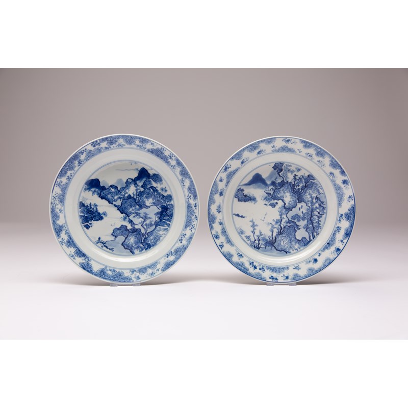 A PAIR OF CHINESE BLUE AND WHITE 'MASTER OF THE ROCKS' DISHES