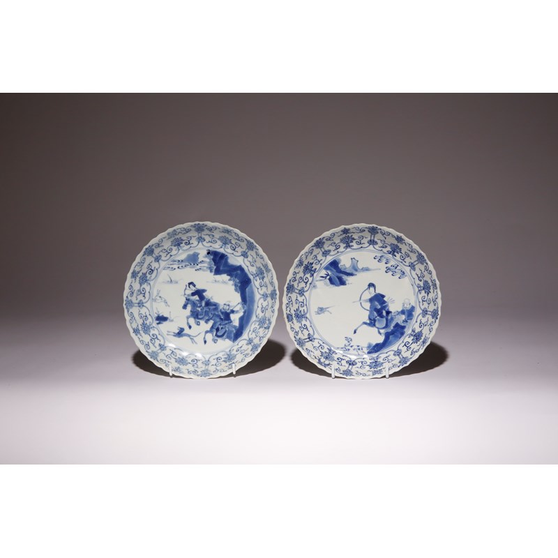 A PAIR OF CHINESE BLUE AND WHITE MOULDED 'HUNTING' DISHES
