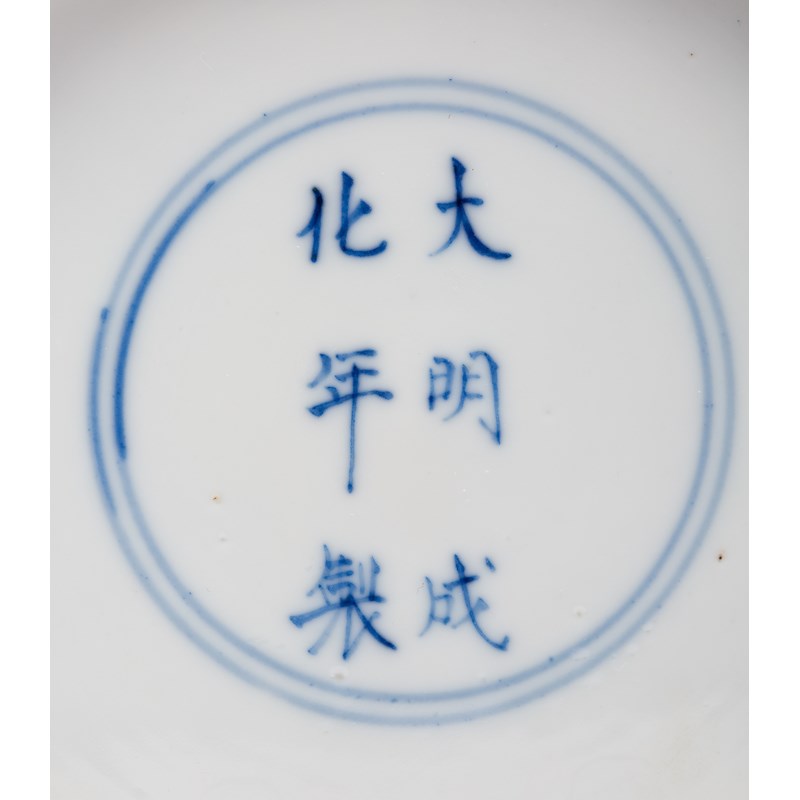 Decorated with three shou characters divided by flowers, ribbon tied cash and swastikas, the border with flowerheads, the base with a Chenghua mark, 15.8cm.
