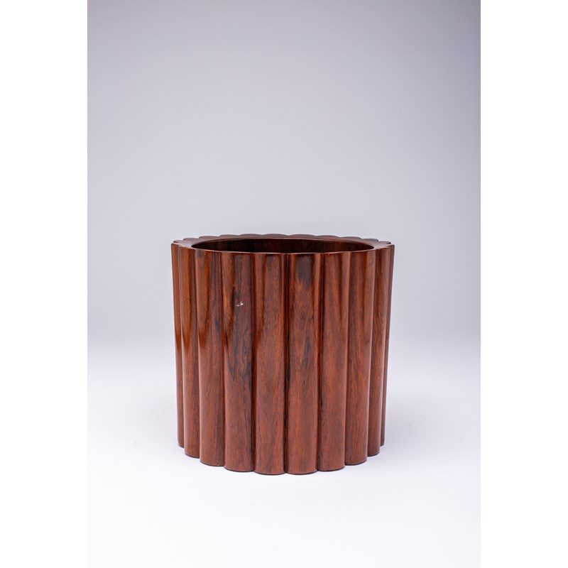The cylindrical body carved with twenty-one rounded reeds, the rim tilting inwards, the base with a replacement plug, 20.5cm.