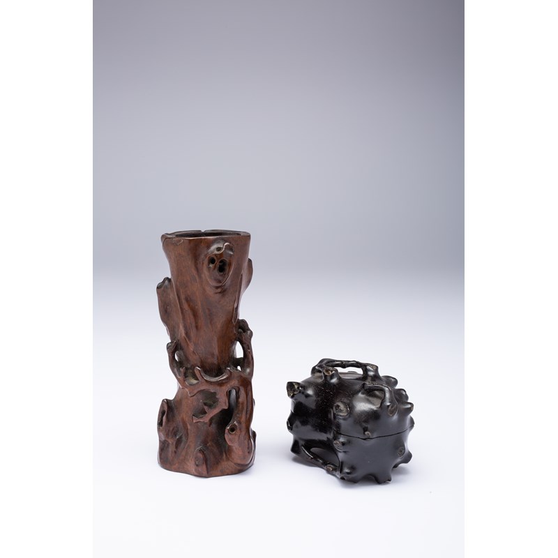 A SMALL ZITAN BOX AND COVER AND AN INCENSE STICK HOLDER