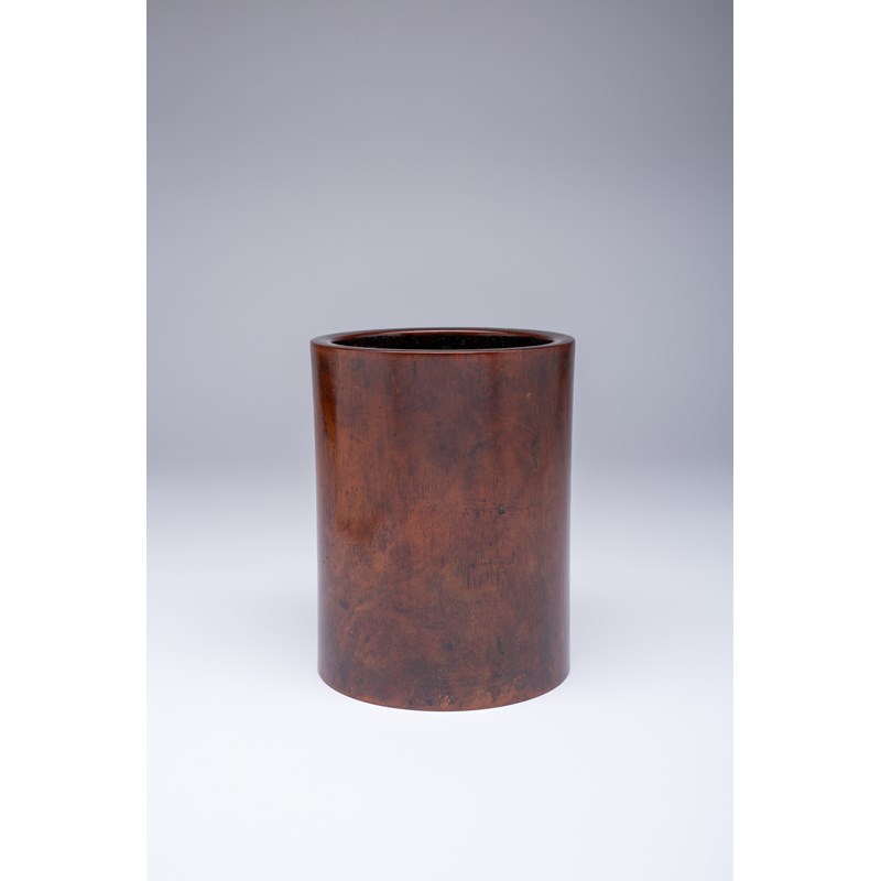 The cylindrical slightly waisted body with a warm chestnut patina, the base with a recessed plug, 16cm.
