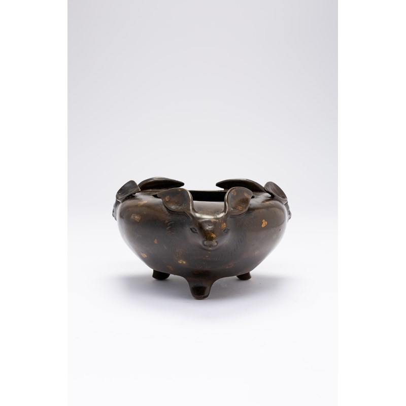 The compressed globular body raised on three tapering feet, the shoulder set with three bats' heads, with their facial features and fur defined, 1kg, 17cm.