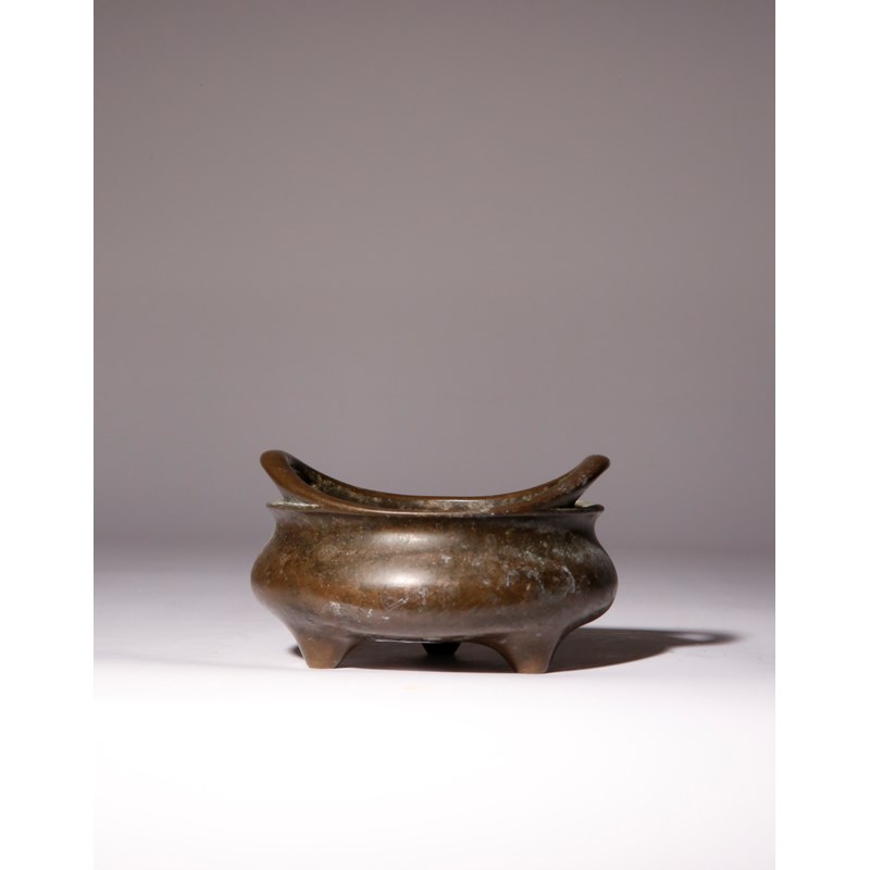 The compressed circular body with two flaring loop handles above a short waisted neck, supported by three tapering feet, the base with a six character Xuande mark, 1.3kg, 14.5cm.