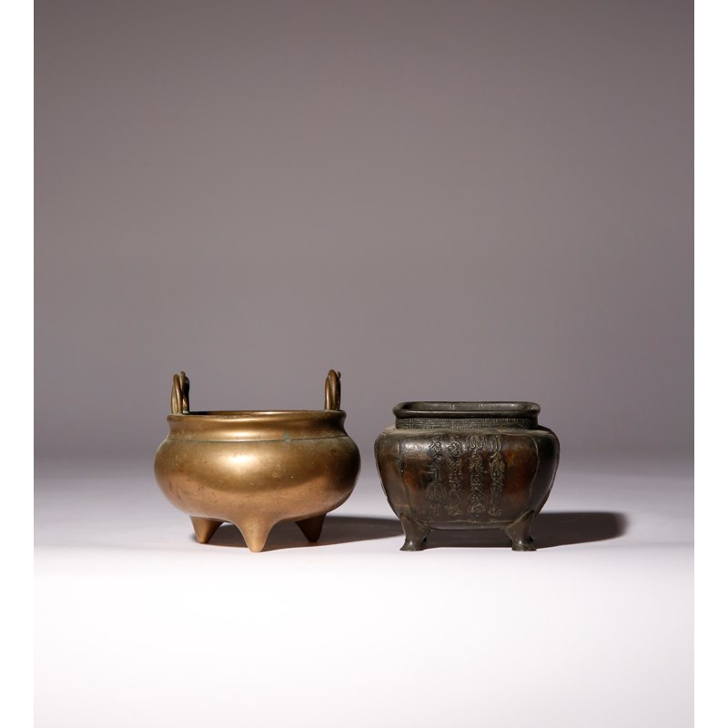 One raised on three tapering feet, set with two twisted rope handles, with a zhen wan mark, the other of square-section, decorated with four panels with archaistic inscriptions, 647g and 624g, 11cm and 9.5cm. (2)