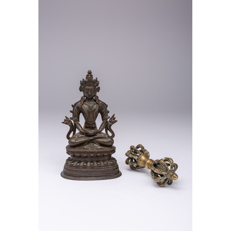 A CHINESE BRONZE FIGURE OF A BODHISATTVA AND A GILT-BRONZE VAJRA