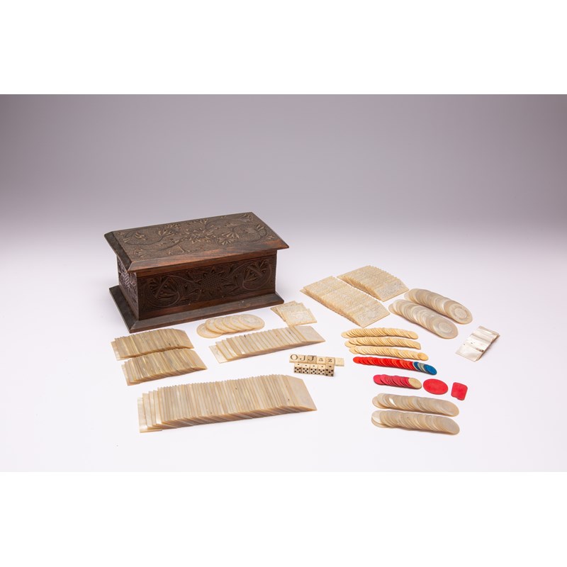 Eighty-five circular and two hundred and thirty rectangular, incised with figures and floral designs; together with bone counters and dice, all contained in a wooden box, 25.8cm wide. (a lot)