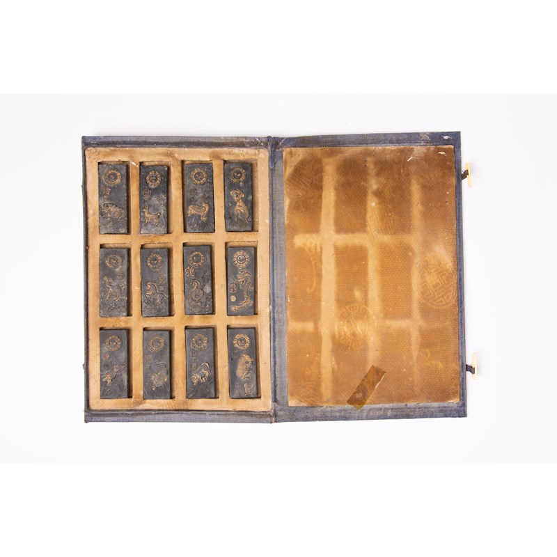 Twelve depicting the animals of the zodiac, a further twelve decorated with flowers and foliage, all with calligraphy on the reverse and contained within two clothbound moulded slipcases, 32.5cm x 22cm. (24)