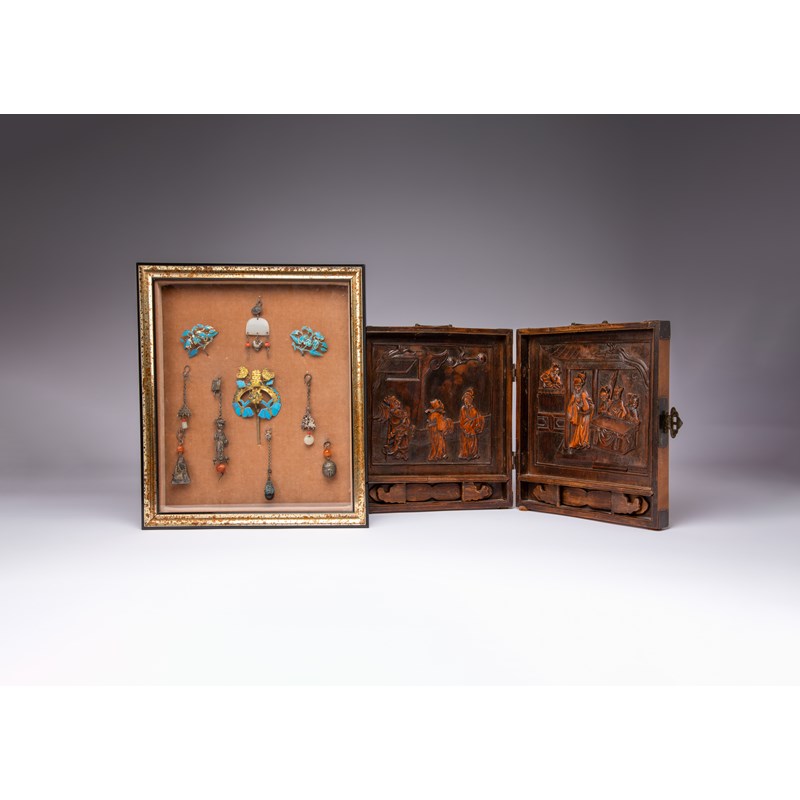 The jewellery comprising: three gilt metal and kingfisher feather decorated hairpins and six silver pendants, variously decorated with shuangxi characters, some adorned with jade and coloured hardstones, all in a glass display case, the two-panelled box carved with dignitaries and their attendants in a fenced garden, with a metal hasp, the jewellery case 36cm x 31cm, the folding box 28cm wide. (2)
