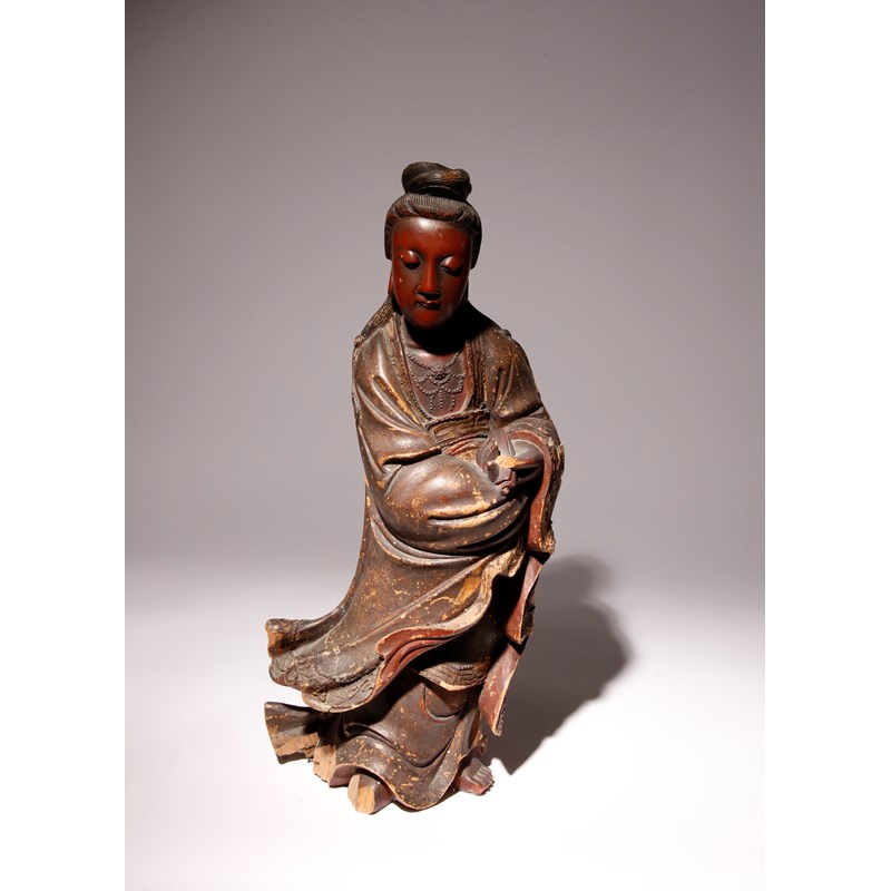 A CHINESE CARVED AND LACQUERED WOOD FIGURE OF GUANYIN