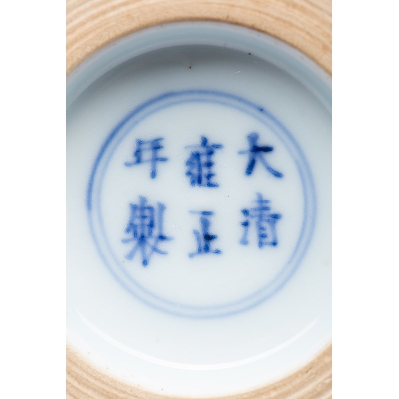 The exterior painted with small figures and groups of huts in a mountainous watery landscape, with a six character Yongzheng mark, 21cm.