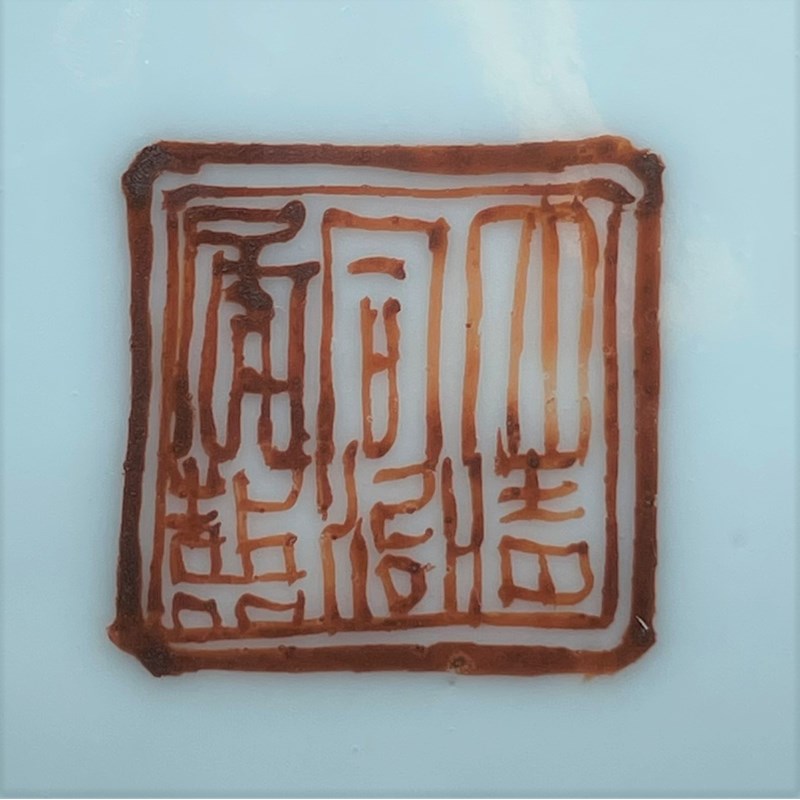Decorated with a continuous scene depicting a dignitary, his attendants and fishermen by a river, the cover with a solitary figure in a landscape, the base with a Tongzhi mark, 12.4cm. (2)