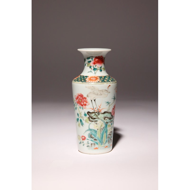 Painted with a crane perched on a rock amidst blossoming peony branches and daffodil sprays, the waisted neck with further floral spray, divided by a diaper border with flowerheads to the shoulder, the base with a paper label for J Reis Fernandes, London, 15.2cm.
