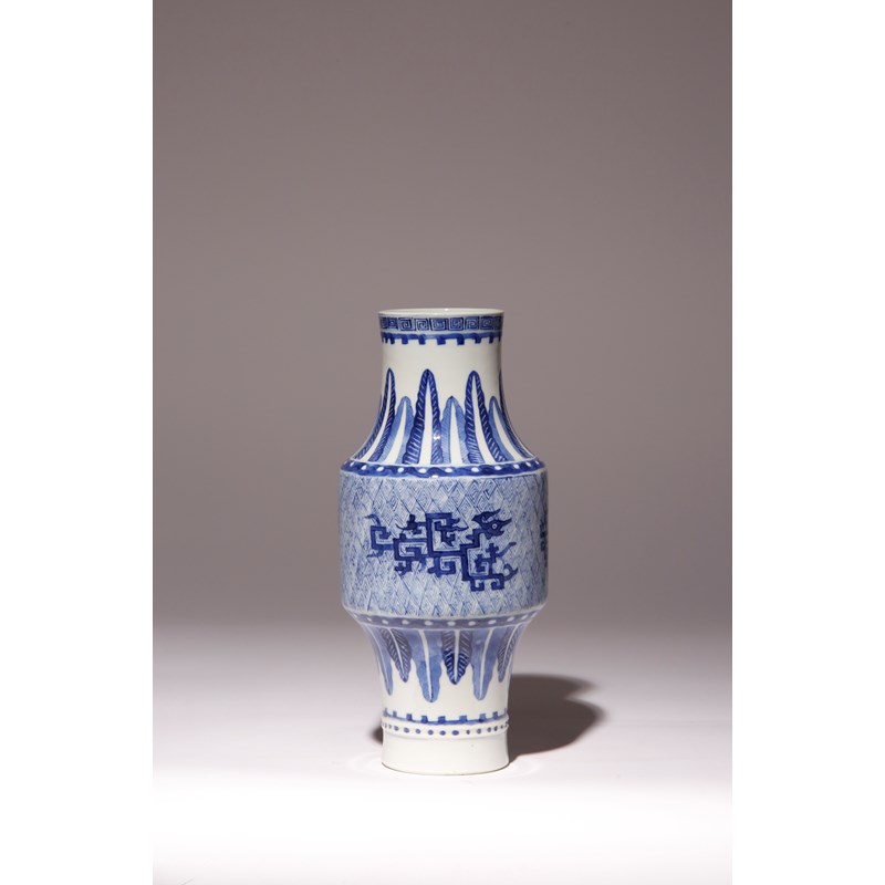 The cylindrical body decorated with stylised kui dragons, on a cell diaper ground between bands of stiff leaves, the base with a four character Kangxi mark, 25cm.