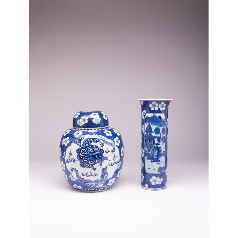 Each decorated with panels containing dragons, tigers, and figures in landscape scenes, all reserved on a prunus and cracked-ice ground, the taller with a Kangxi mark, 26.5cm and 30.8cm. (3)