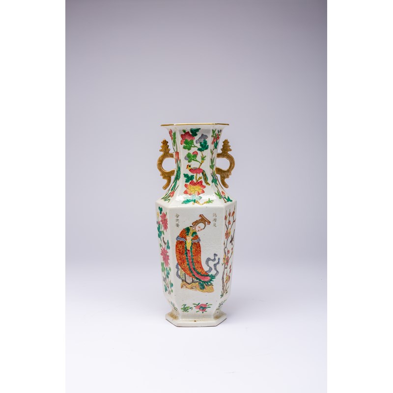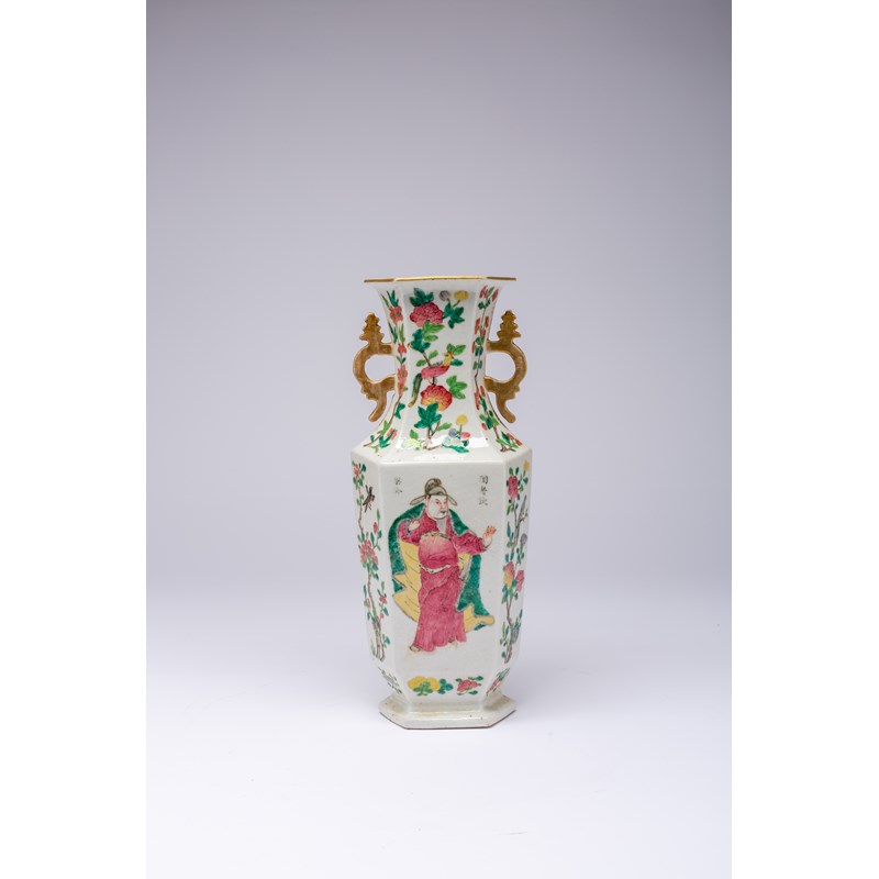 A CHINESE FAMILLE ROSE HEXAGONAL-SECTION 'WU SHANG PU' VASE
