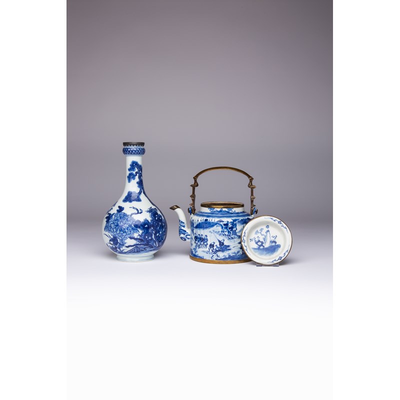 Each mounted with metal, the bottle vase painted with peonies growing from leafy branches below a pine tree, with a paper label for Christie's to the base, the teapot decorated with a hunting scene, the base with a Kangxi mark, 23.5cm and 18cm. (3)
