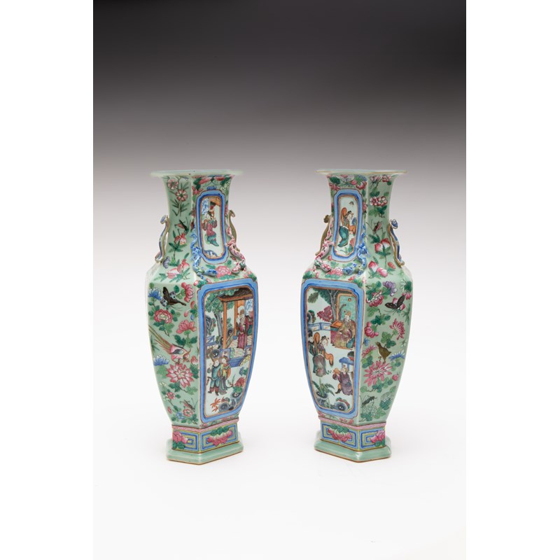 Each of hexagonal-section, painted with panels enclosing dignitaries, ladies and actors, surrounded by birds and insects perched amidst blossoming flowers, each waisted neck with moulded chilong and a pair of ruyi-sceptre handles, all reserved on a celadon-ground, 59.8cm. (2)