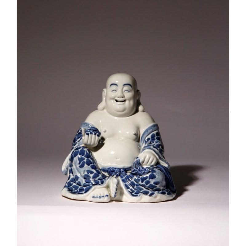 A CHINESE BLUE AND WHITE SEATED FIGURE OF BUDAI HE SHANG