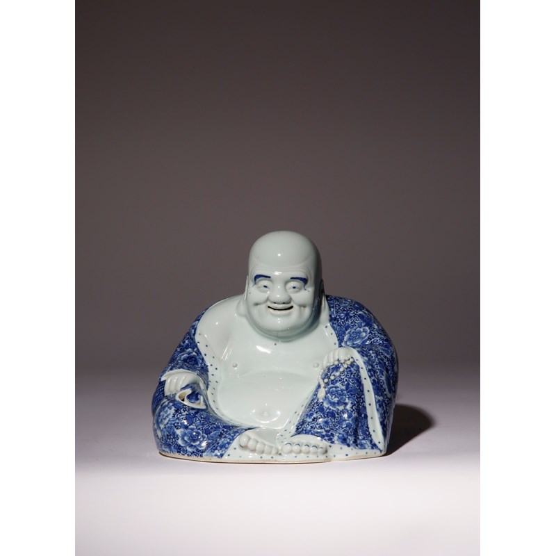 A CHINESE BLUE AND WHITE SEATED FIGURE OF BUDAI HE SHANG