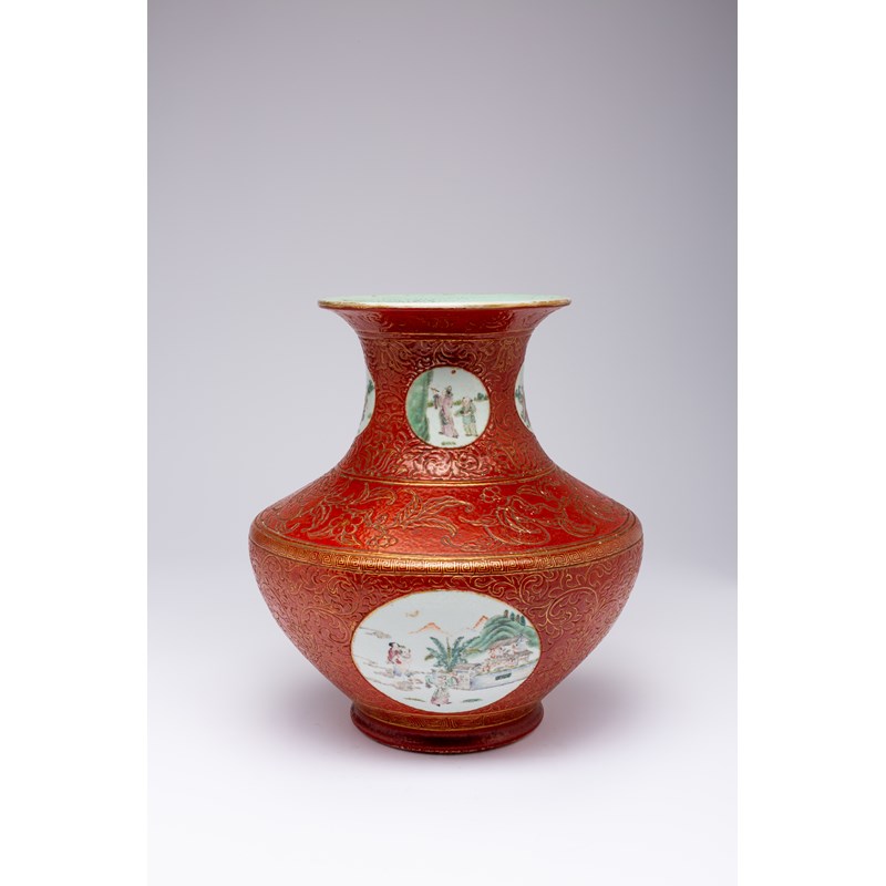 A LARGE CHINESE FAMILLE ROSE CORAL-RED GROUND VASE