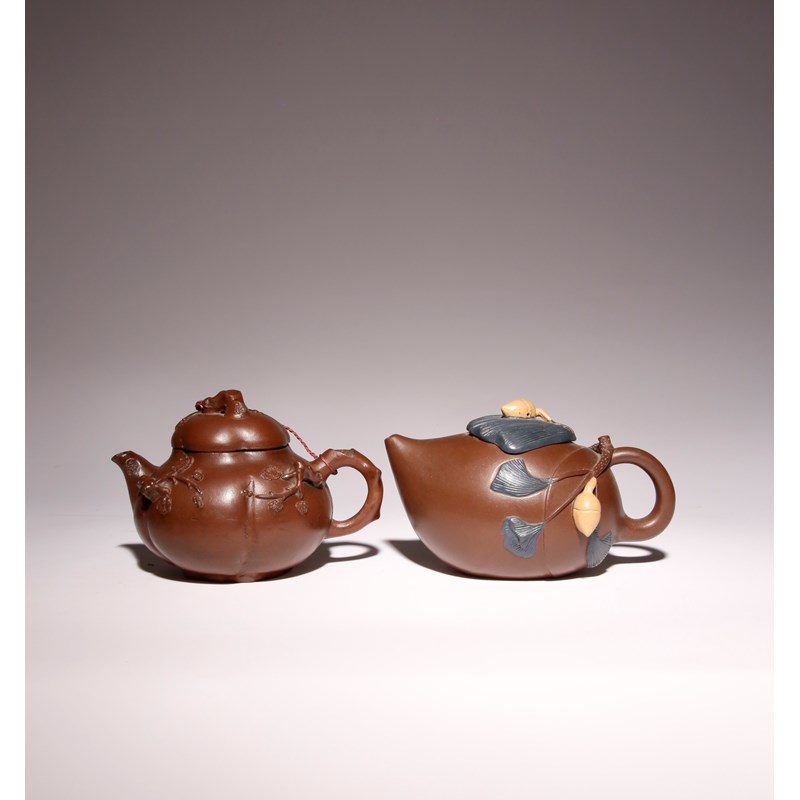 One decorated with ginkgo nuts and branches to the ovoid body, the base with an artist's seal reading Wu Yayi Zhi, the leaf-shaped cover with two seals reading Wu and Yayi, the other lobed teapot with sprays of blossoming prunus to the sides, the spout, handle and knop formed as the branches, the cover with two seal marks, 17.5cm and 14.7cm. (4)