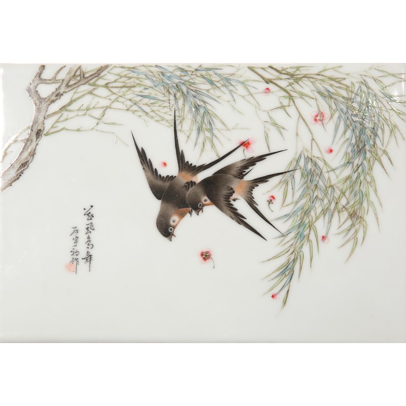 Painted with two swallows beneath willow branches, and pink prunus blossoms, with two lines of calligraphy and an artist's seal, 17.5cm x 25cm.
