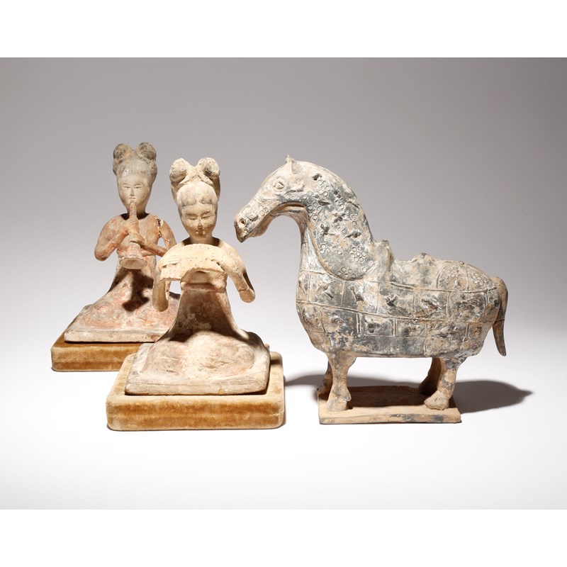 A PAIR OF CHINESE PAINTED POTTERY FIGURES OF MUSICIANS AND A POTTERY MODEL OF A HORSE