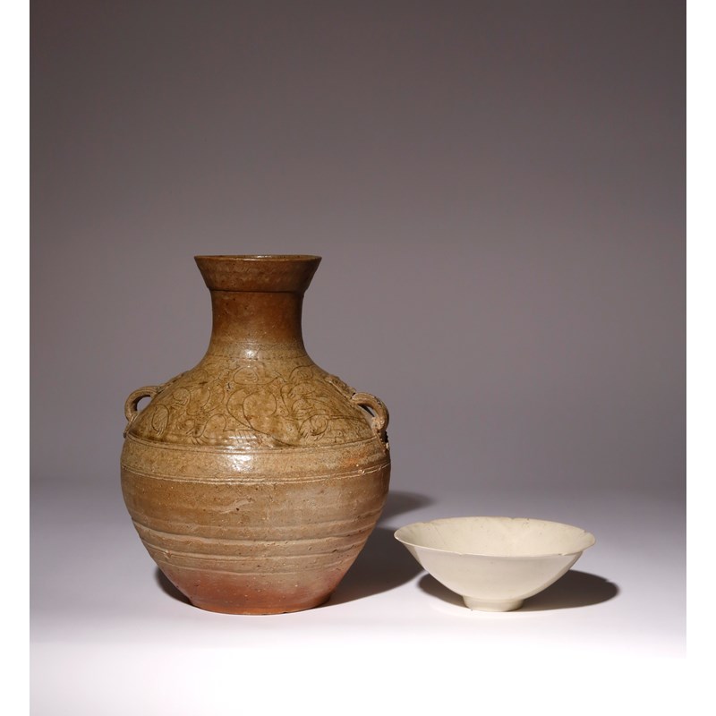 A CHINESE YUE CELADON HU-SHAPED VASE AND A QINGBAI FOLIATE BOWL