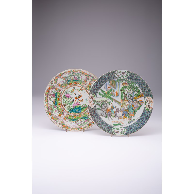 One painted in famille rose enamels, with butterflies, birds and squirrels, the other painted with figures within a diaper border, 34.5cm. (2)
