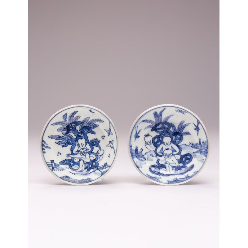 A PAIR OF SMALL CHINESE BLUE AND WHITE 'BOYS' DISHES