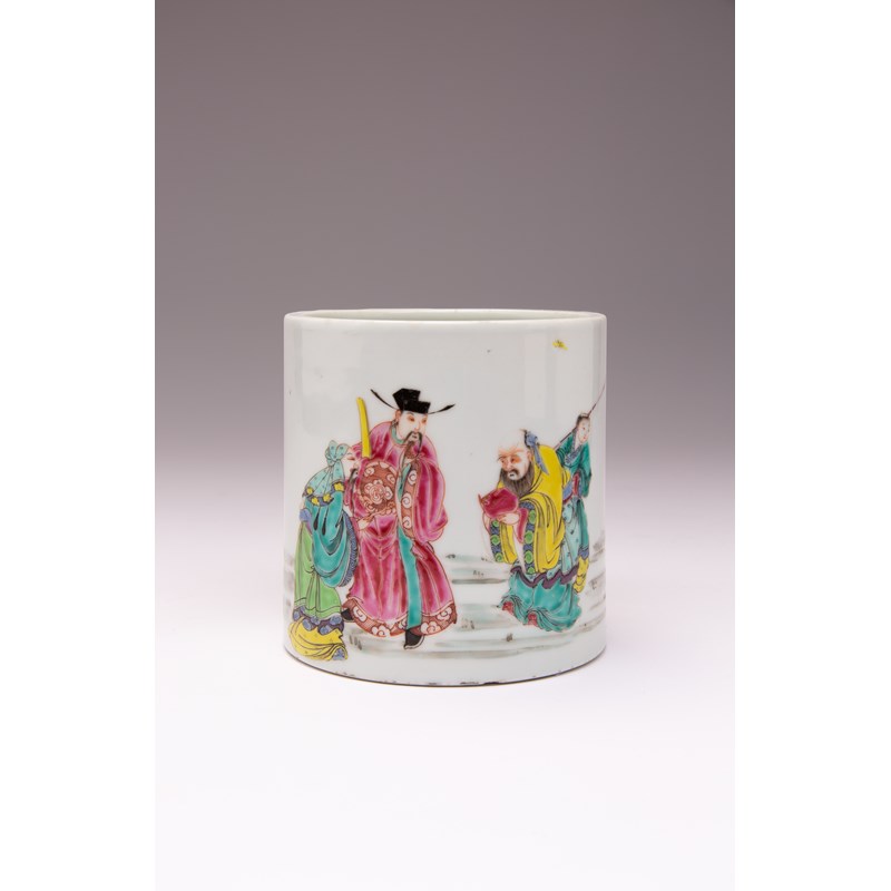 A CHINESE FAMILLE ROSE 'SANXING' CYLINDRICAL BRUSHPOT, BITONG