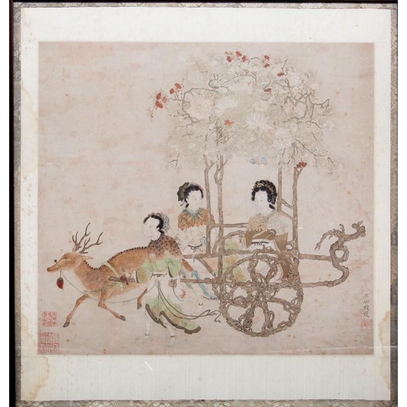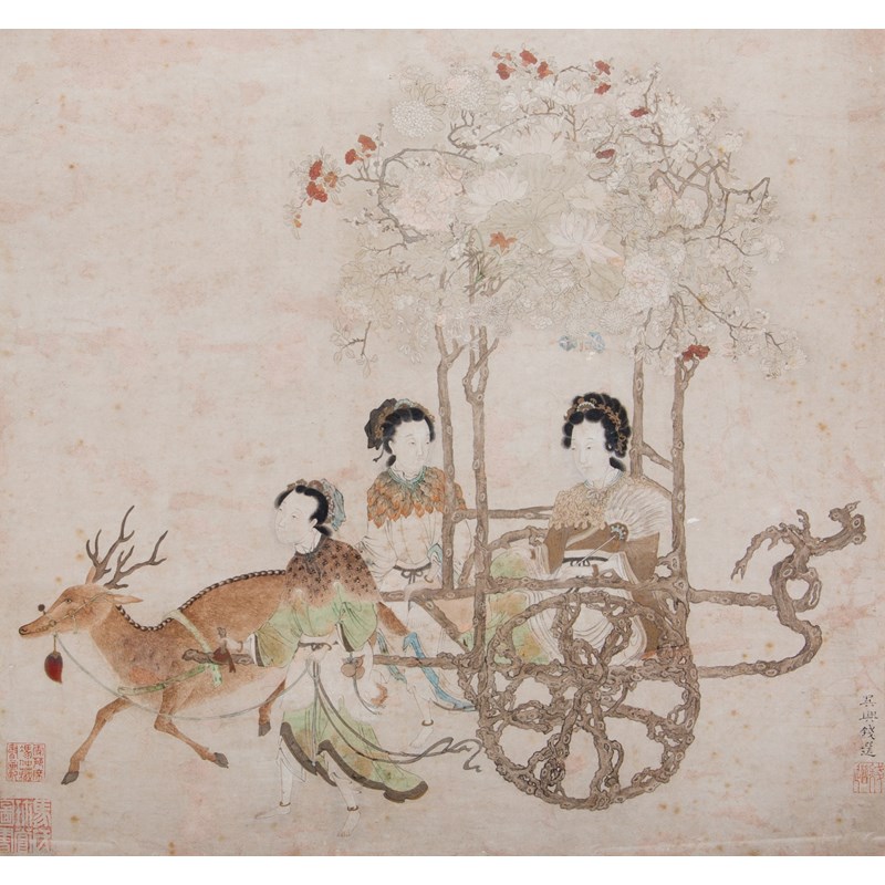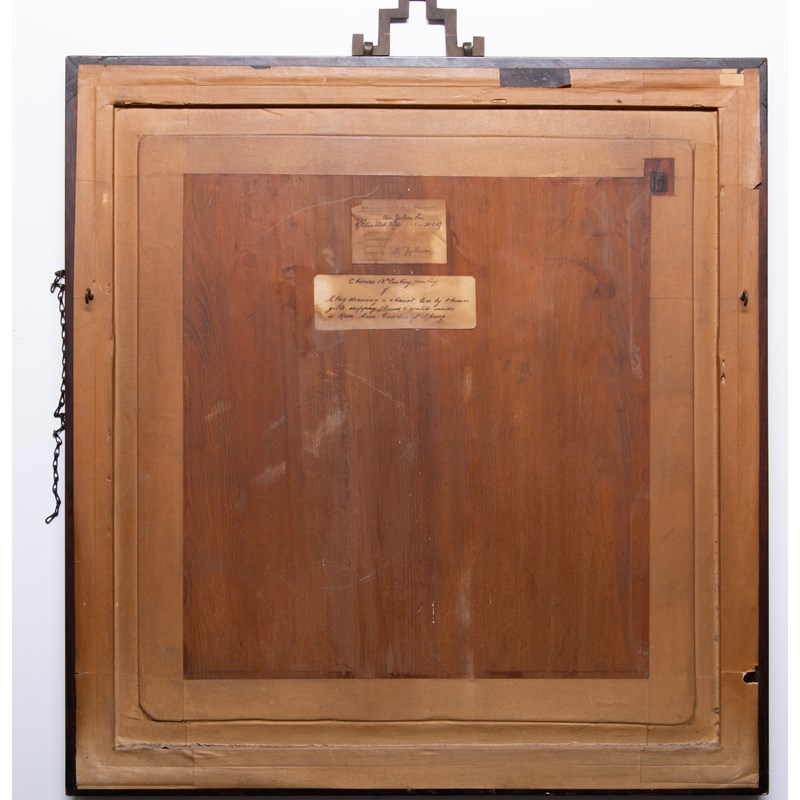 A Chinese painting, ink and colour on paper, inscribed and signed Wuxing Qian Xuan with one artist's seal and two collectors' seals, framed and glazed, the reverse with a paper label for Whitworth Art Gallery, Manchester, 49cm x 52cm.