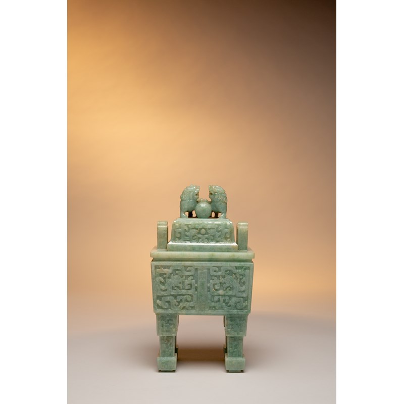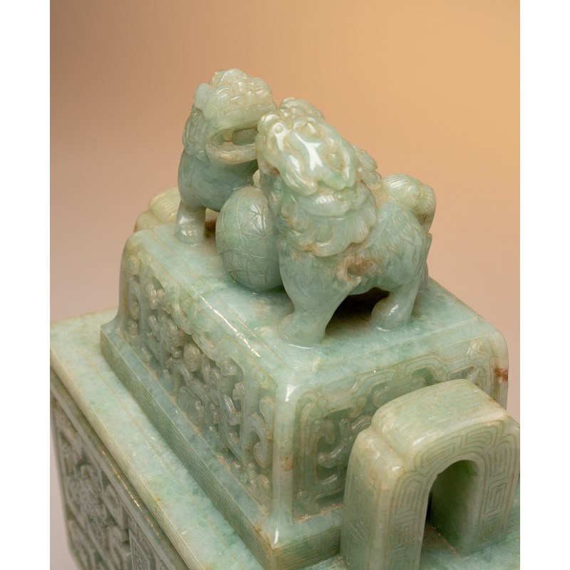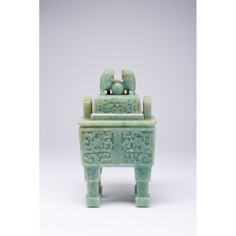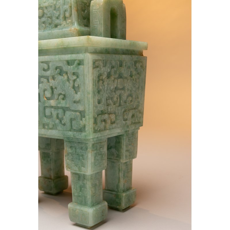 A MASSIVE CHINESE JADEITE ARCHAISTIC INCENSE BURNER AND COVER, FANGDING