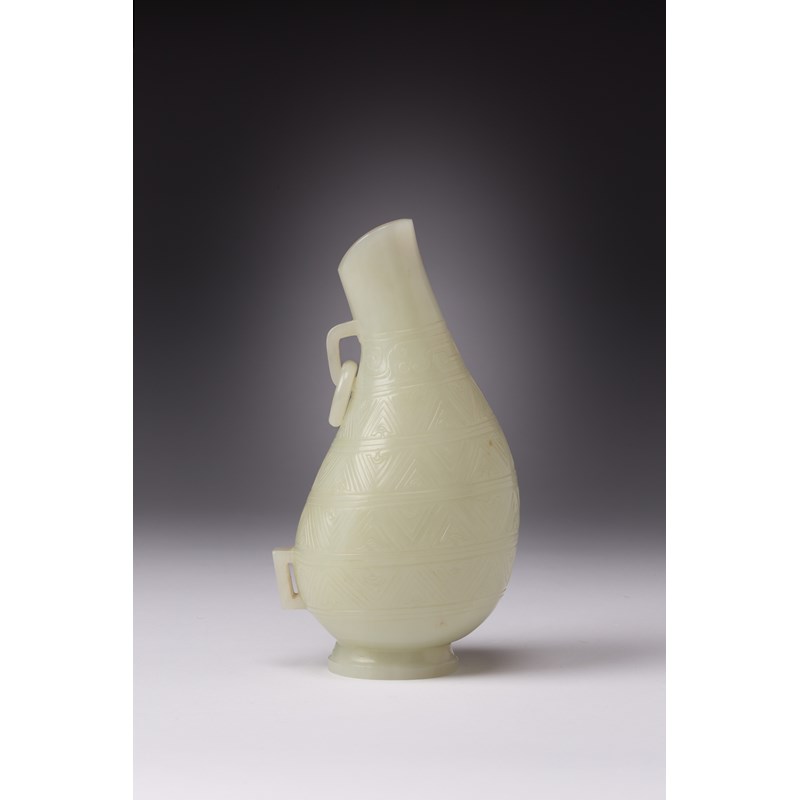 Raised on a splayed foot, decorated with bands of geometric patterns and archaistic scrolls, set with two loop handles to one side, one with a suspended loose ring, the stone of an even tone with minor white and russet inclusions, 15.8cm.