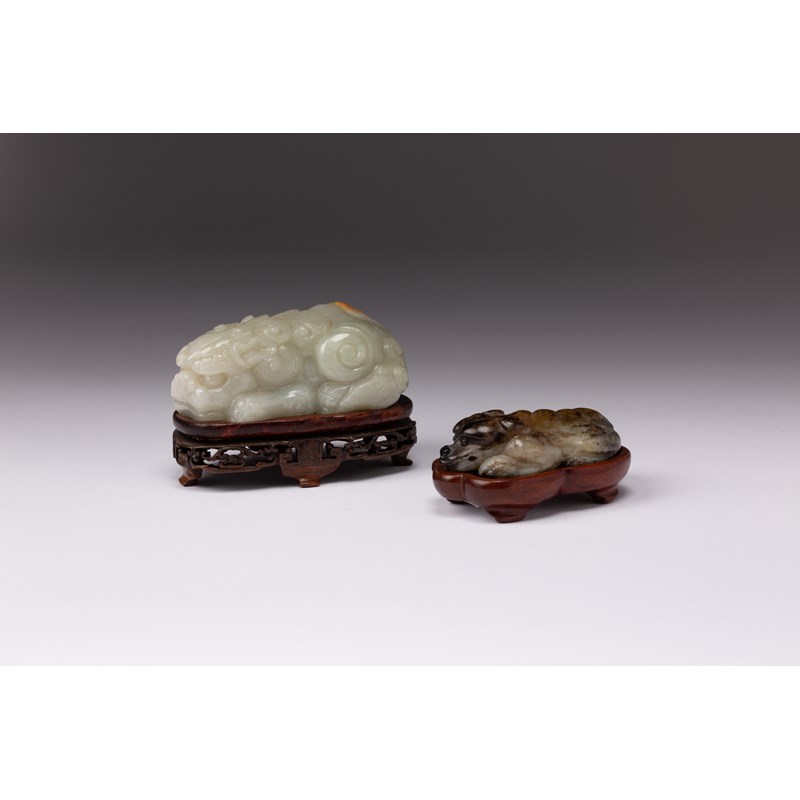 One jadeite, carved as a Buddhist lion, the stone of celadon with minor russet inclusions, the other black and grey nephrite jade of a dog, each resting with its legs tucked under the body, with two wood stands, 8.5cm and 7.3cm. (4)