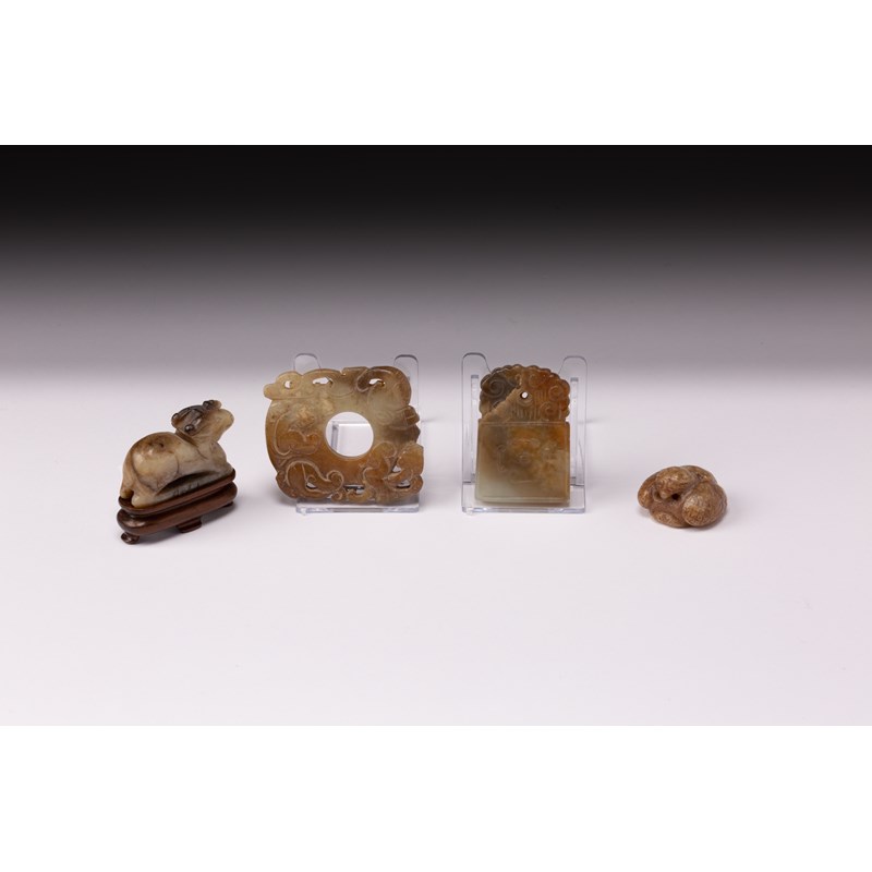 FOUR CHINESE CELADON AND RUSSET JADE ITEMS