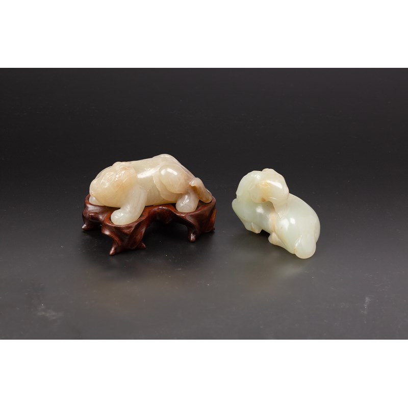 TWO CHINESE CELADON JADE CARVINGS OF RECUMBENT ANIMALS