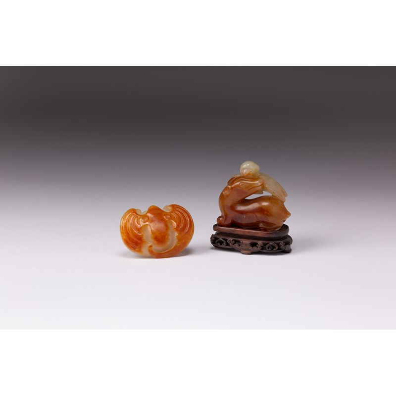 One carved as a recumbent beast with a bird picked out in celadon, the other depicting a peach in white stone, with a bat in russet to the reverse, with a wood stand, 5cm and 4.9cm. (3)