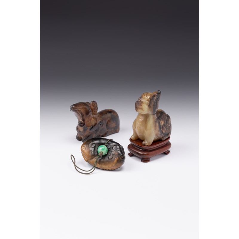 Comprising: a recumbent deer holding a lingzhi sprig in its mouth, a single horned mythical beast crouching with its head raised, the third depicting two reclining badgers with a green glass bead, with a wood stand, 9cm. (4)