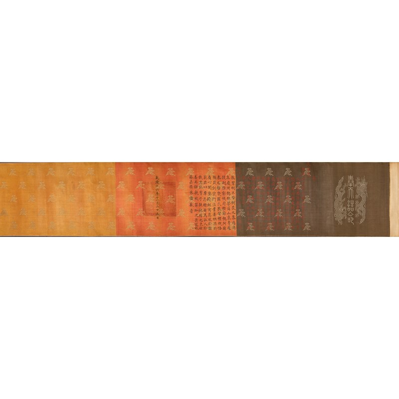 Written on silk woven with clouds, mounted as a hand scroll, the text arranged in kaishu and Manchurian in standard form reading from right to left, opening with a character title feng tian gao ming flanked by a pair of dragons, dated 25th of the 11th month in 1752, 281cm x 29.5cm.