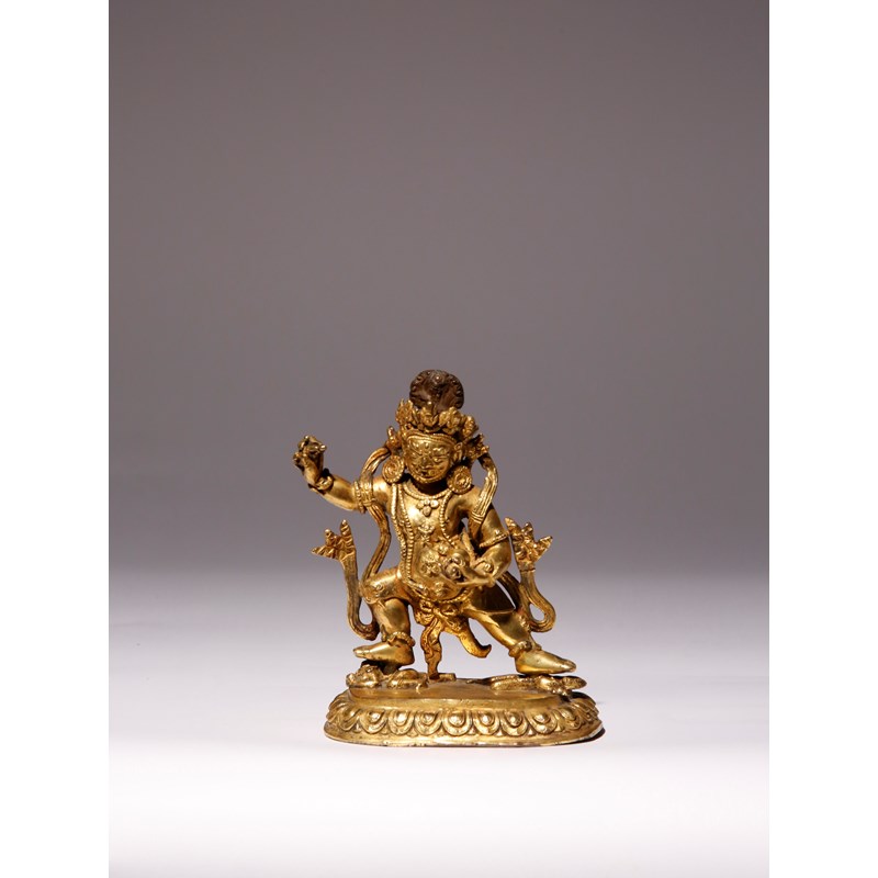 Standing in a dynamic pose on a lotus pedestal, with a vajra in his raised right hand and a ghanta in his left hand, he wears a long bead necklace and an ornate tiara, and stands on the bodies of defeated deities, the copper base with a double vajra, 782g, 14.5cm.