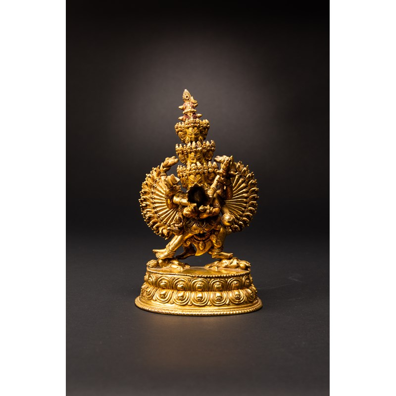 Depicting Chakrasamvara standing in yab-yum with his consort Vajravarahi upon a lotus base, with sixteen heads and thirty-two arms radiating around him, his principal arms holding a khatvanga, a kartika, a kapala and a vajra, both adorned with elaborate beaded jewellery and crowns of skulls, 1.6kg, 21.5cm.