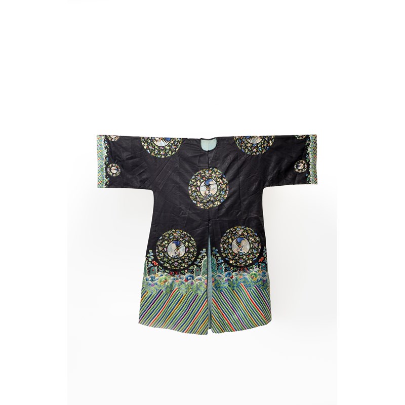 A CHINESE MIDNIGHT-BLUE GROUND SILK EMBROIDERED 'CRANES' SURCOAT, CHANGPAO