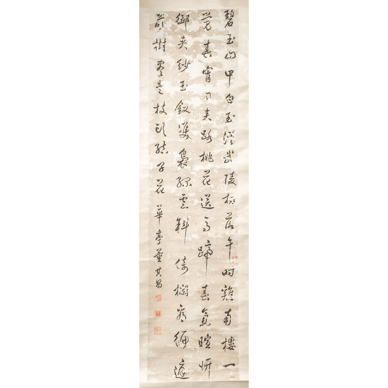 A Chinese calligraphic scroll, ink on paper, with a signature and with four artists' seals, 177cm x 43cm.