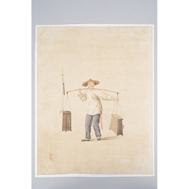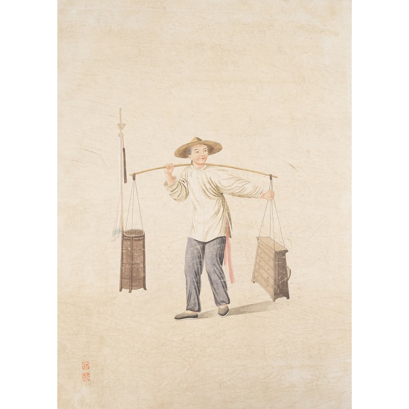 Depicting a furniture vendor, two red seal marks, 42cm x 31cm.