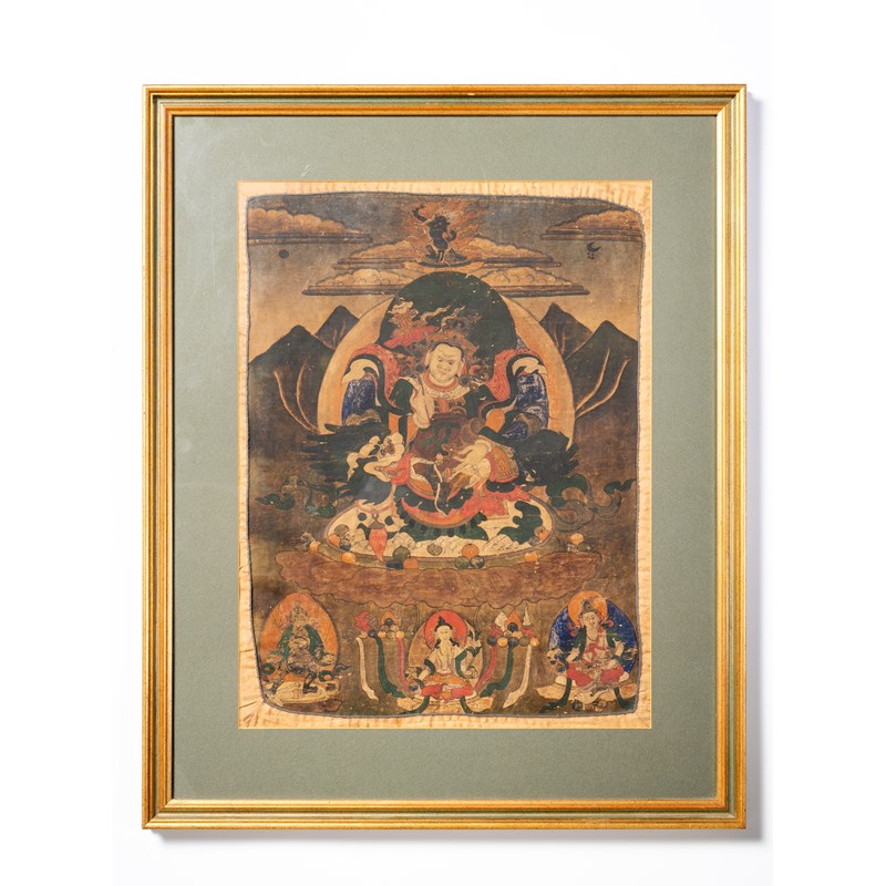 Depicting Vaishravana, the God of Wealth and Guardian of the North sits on a ferocious lion, framed and glazed, 48cm x 36cm.