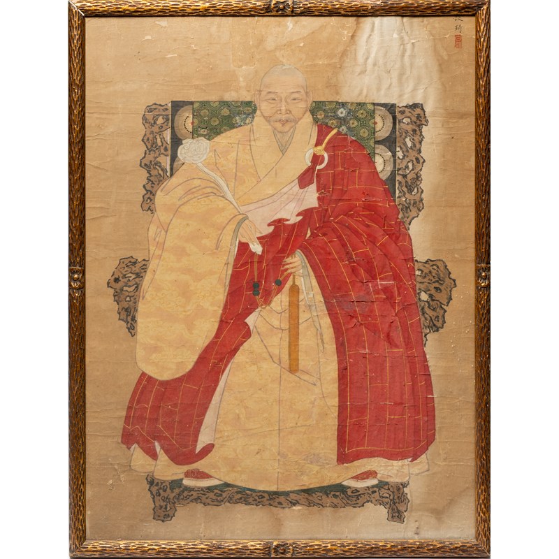 A Chinese painting, ink and colour on paper, depicting a monk sitting holding a sceptre, signed with an artist's seal, framed and glazed, 78.5cm x 58.5cm.