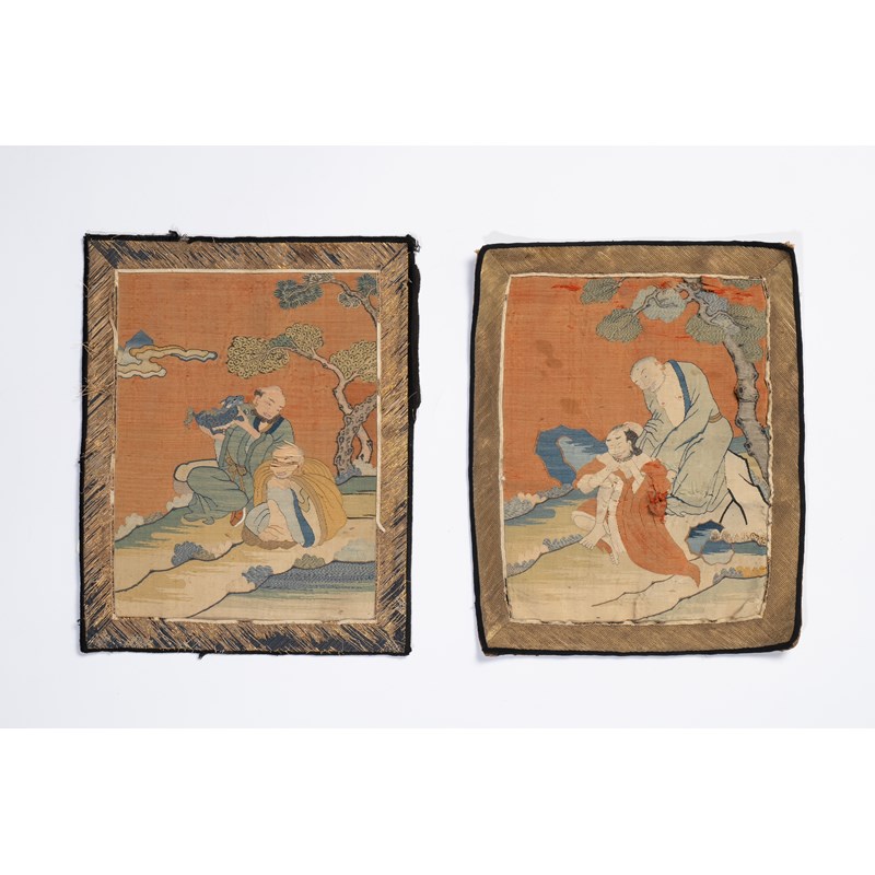 Each woven with two monks beneath trees, one figure crouching and holding a qilin, the borders woven with oblique threads, 30cm x 34cm. (2)